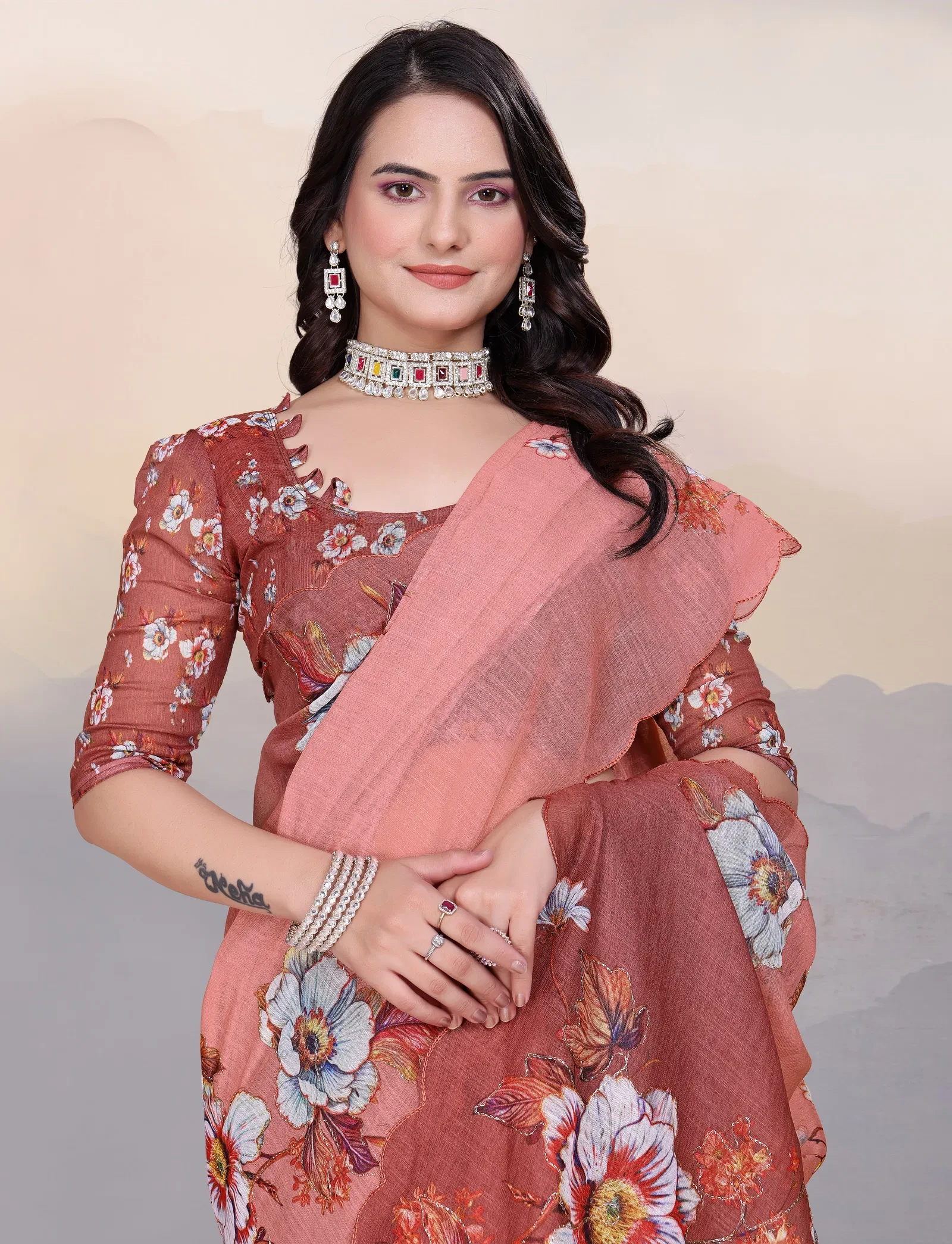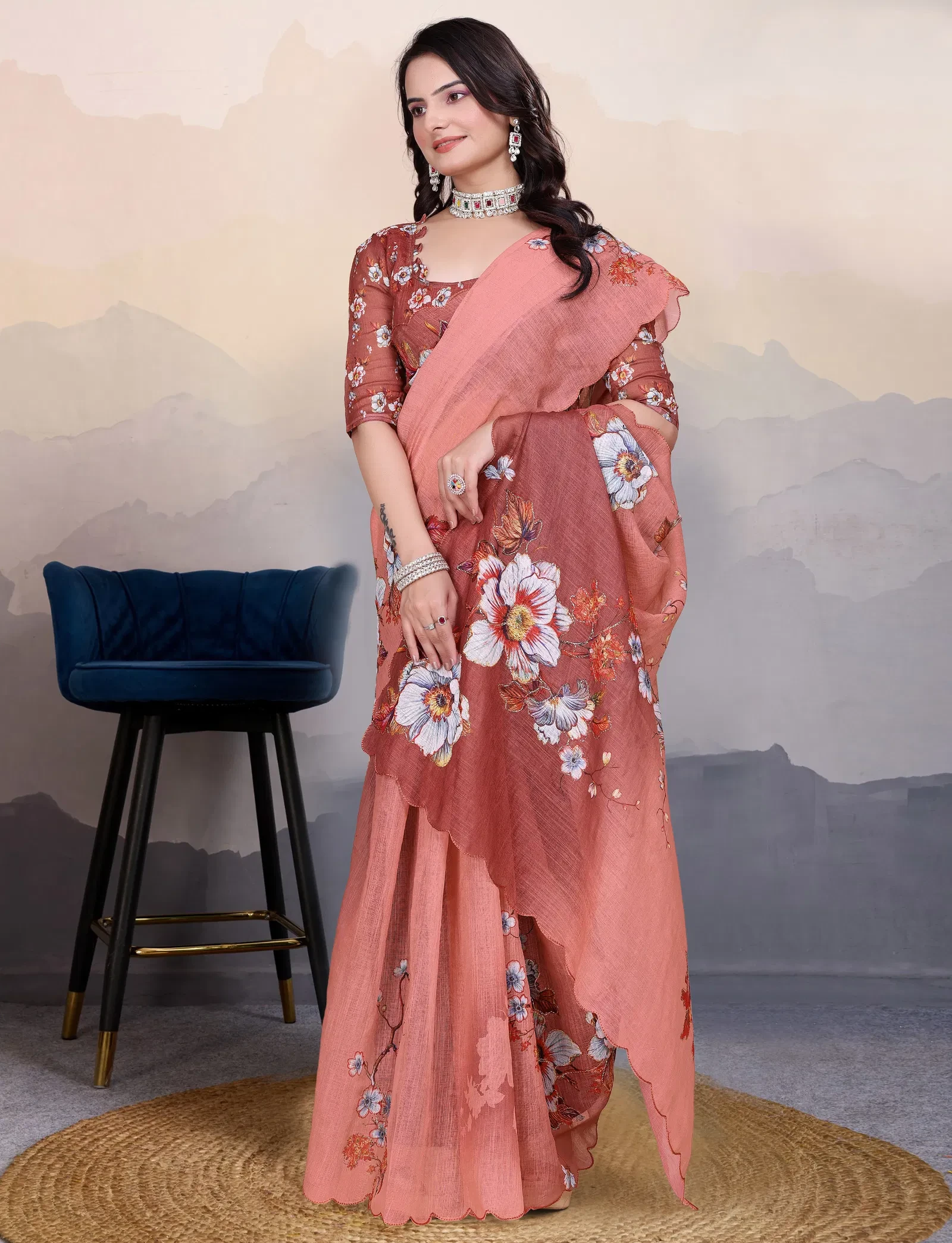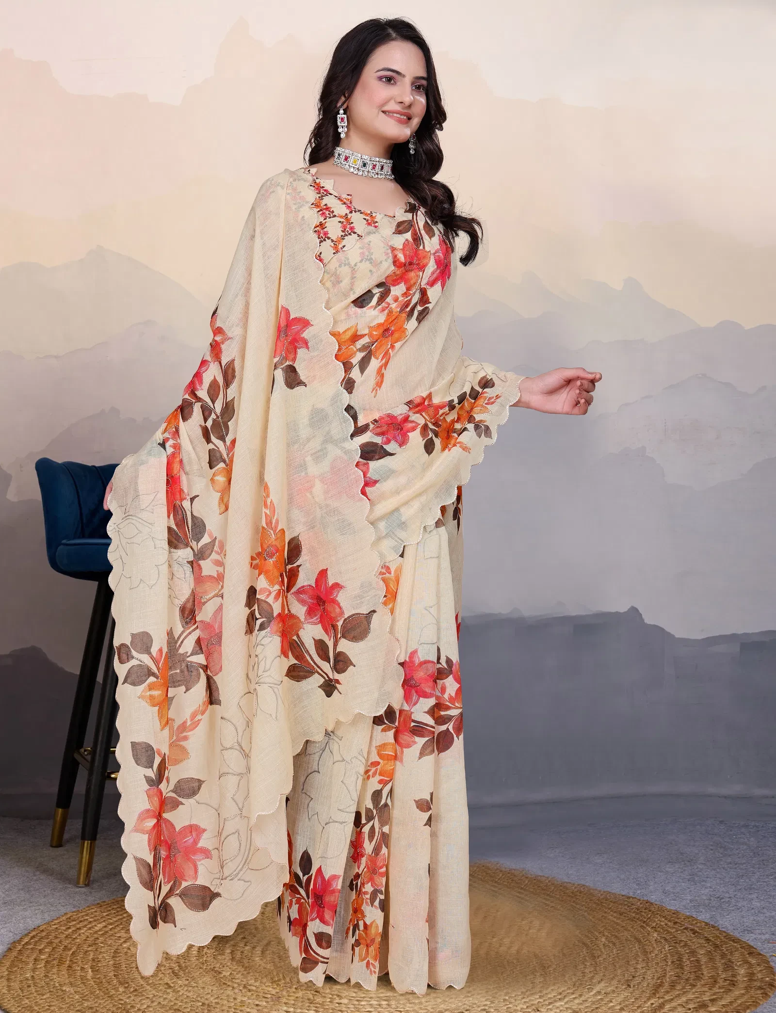Saree Cotton Linen Aari Bharat Work Digital Printed Saree