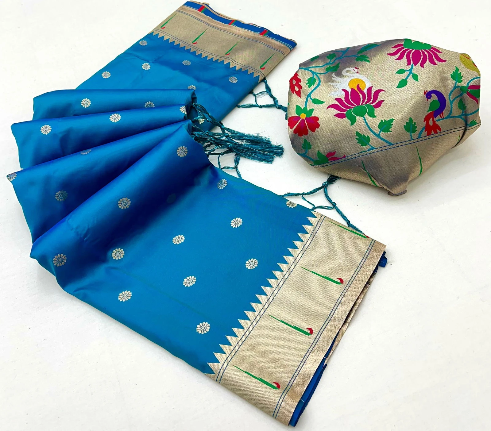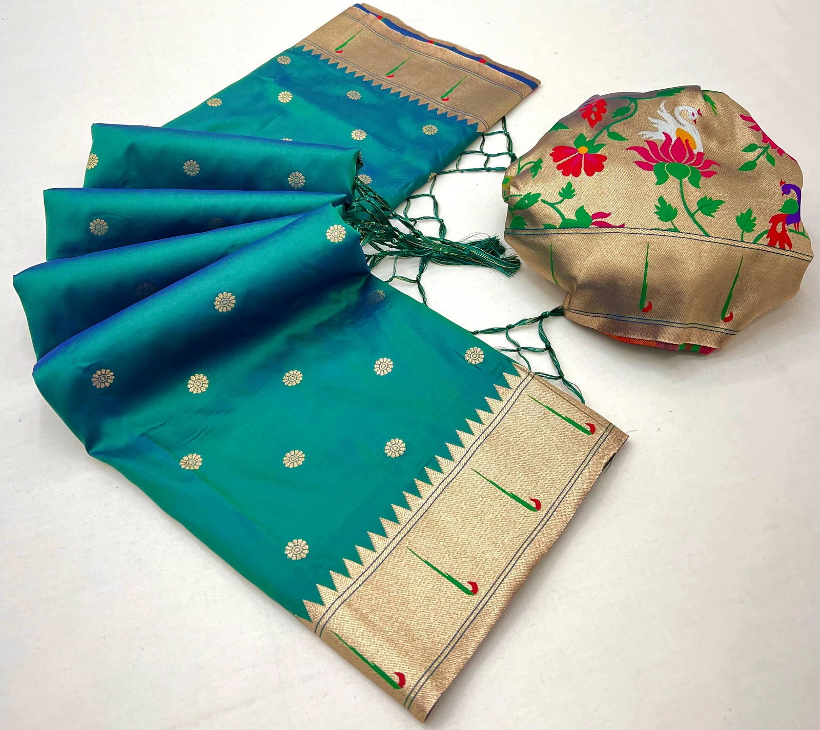 Saree Paithani Silk with Woven Work and Embellished with Golden Zari & Meenakari Threads Unique Motifs