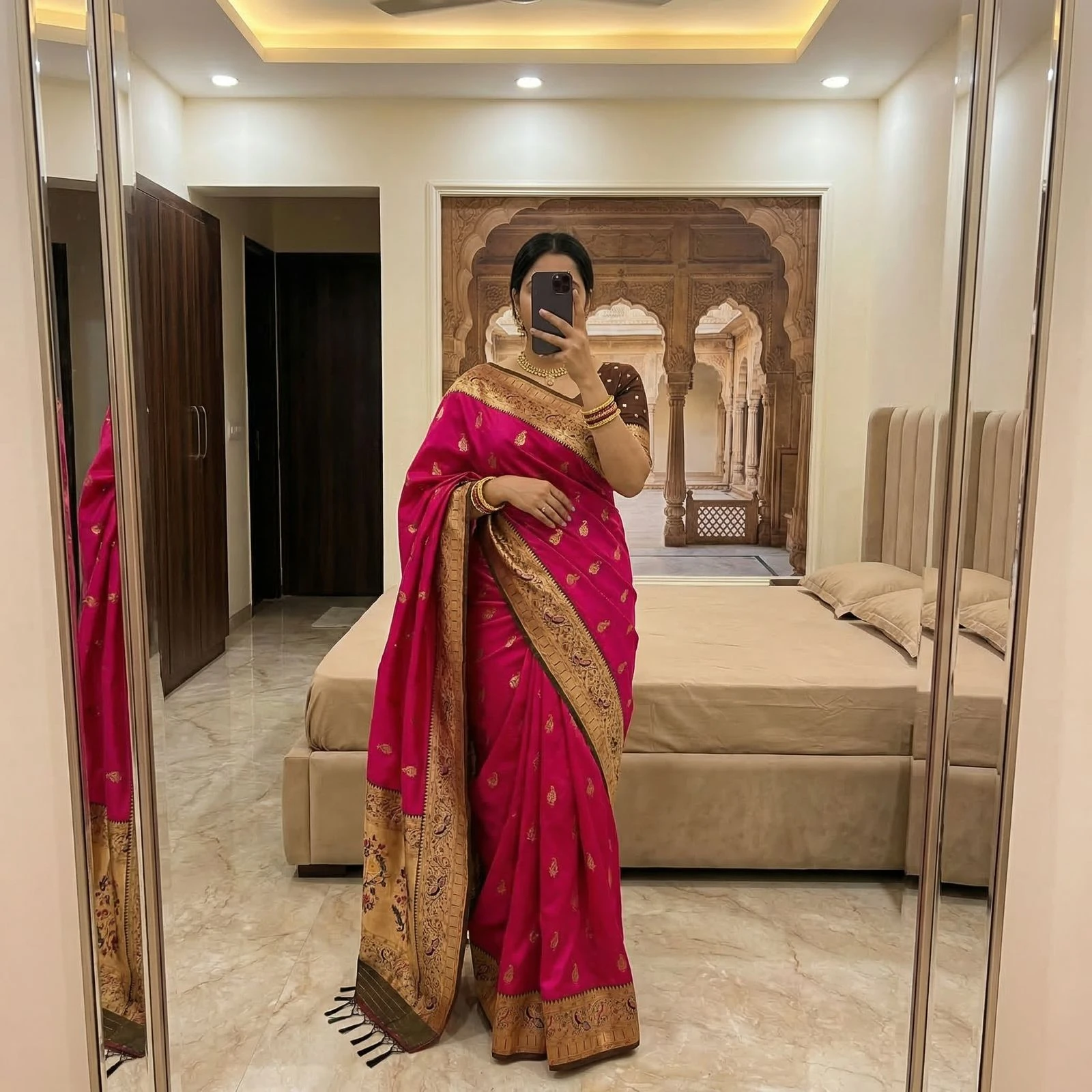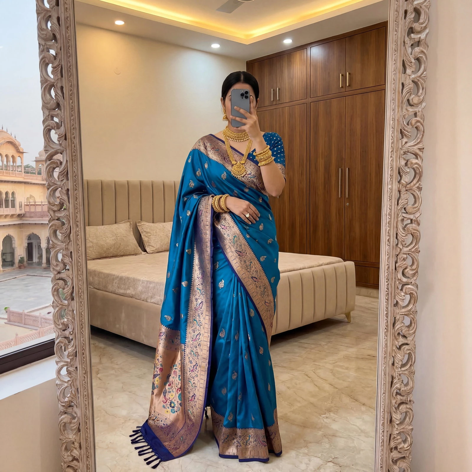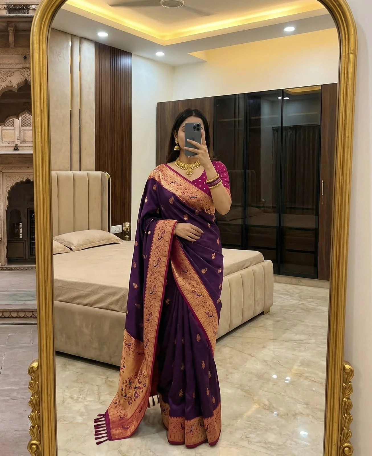 | Saree | Soft Paithani Silk with Banarasi Paithani Style with Rich Zari Weaving Work |